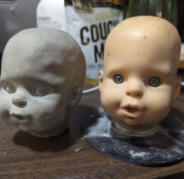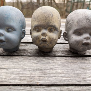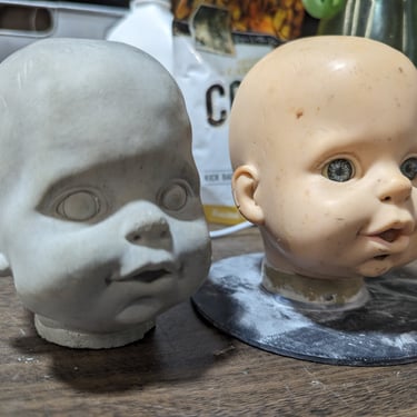 On our family farm of 150+ years in North Carolina my brother found a plastic doll head while operating an excavator in an old debris pile. Our family hasn't lived on the property for many decades. He saw this creepy baby head staring at him in the middle of all the debris. He found it strangely interesting and pulled it out. We suspect this head is from the 1950's based on when little girls lived there. The head found itself in random places around the farm and everyone would say that the baby head was creepy and constantly staring at them.