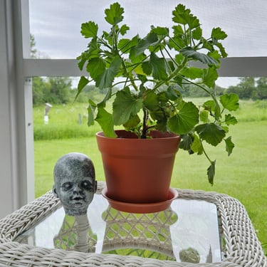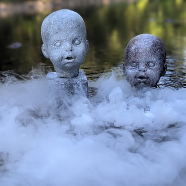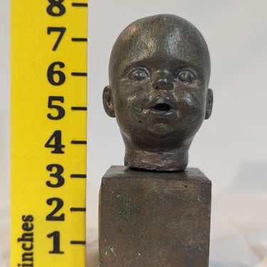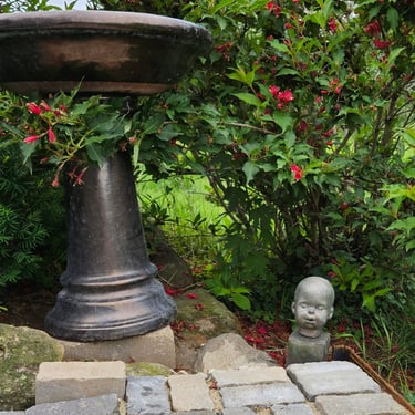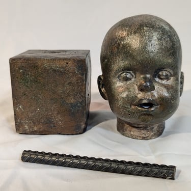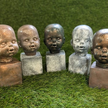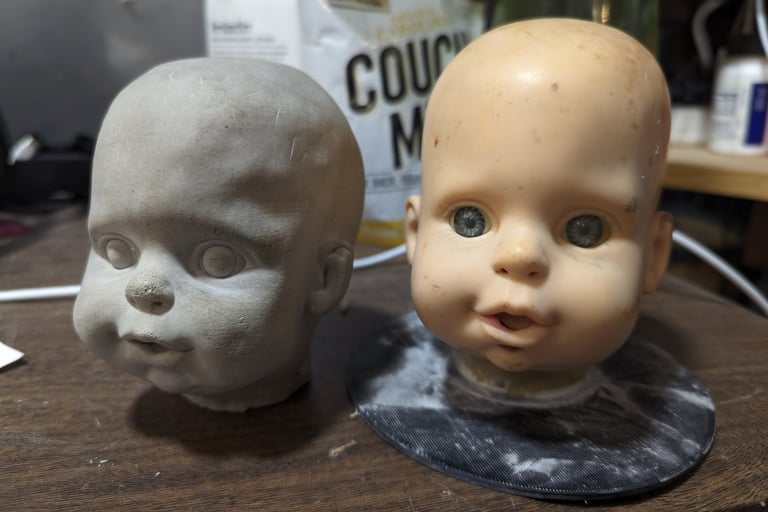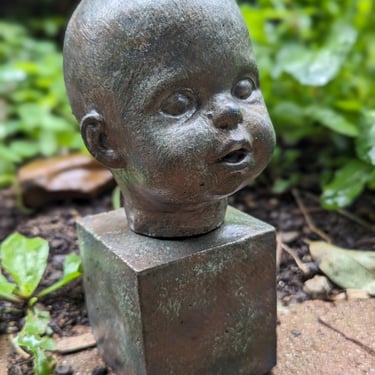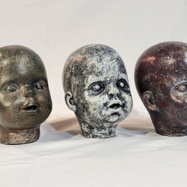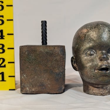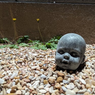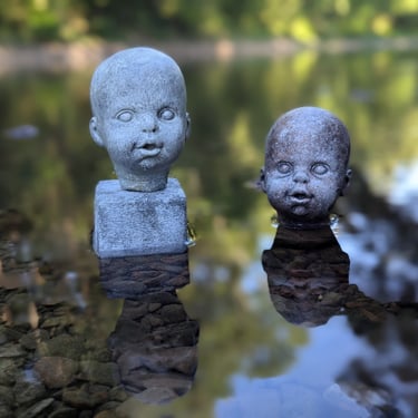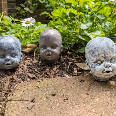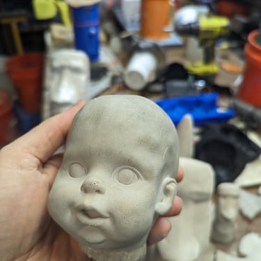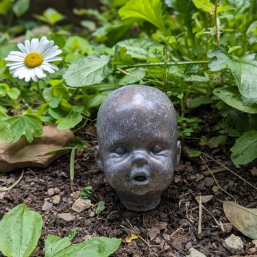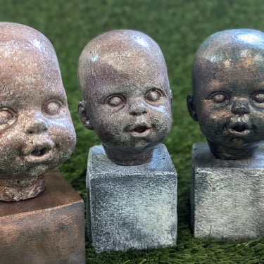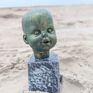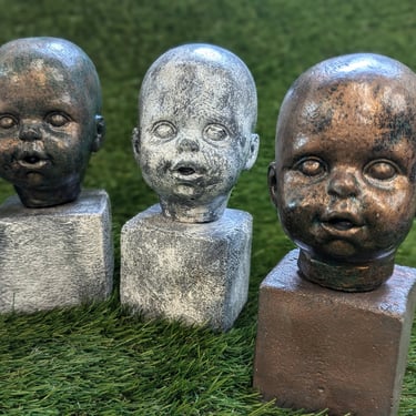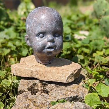To memorialize the vintage doll head my brother suggested I cast it in cement using my special statuary techniques. The original plastic head was cleaned up and coated in many layers of rubber latex. The head was then 3D scanned to assist in building a shell using 3D printing to build the right support to hold the cement during curing. The block stand it sits on was fabricated using computer aided design programs and 3D printing. The finished product is then soaked in a cement stain. Your chosen finish is then applied and then topped off with polyurethane to seal it up to last for decades. So the little head lives on and is now in homes and gardens all over the United States. Contact me if you wish to buy one or several.